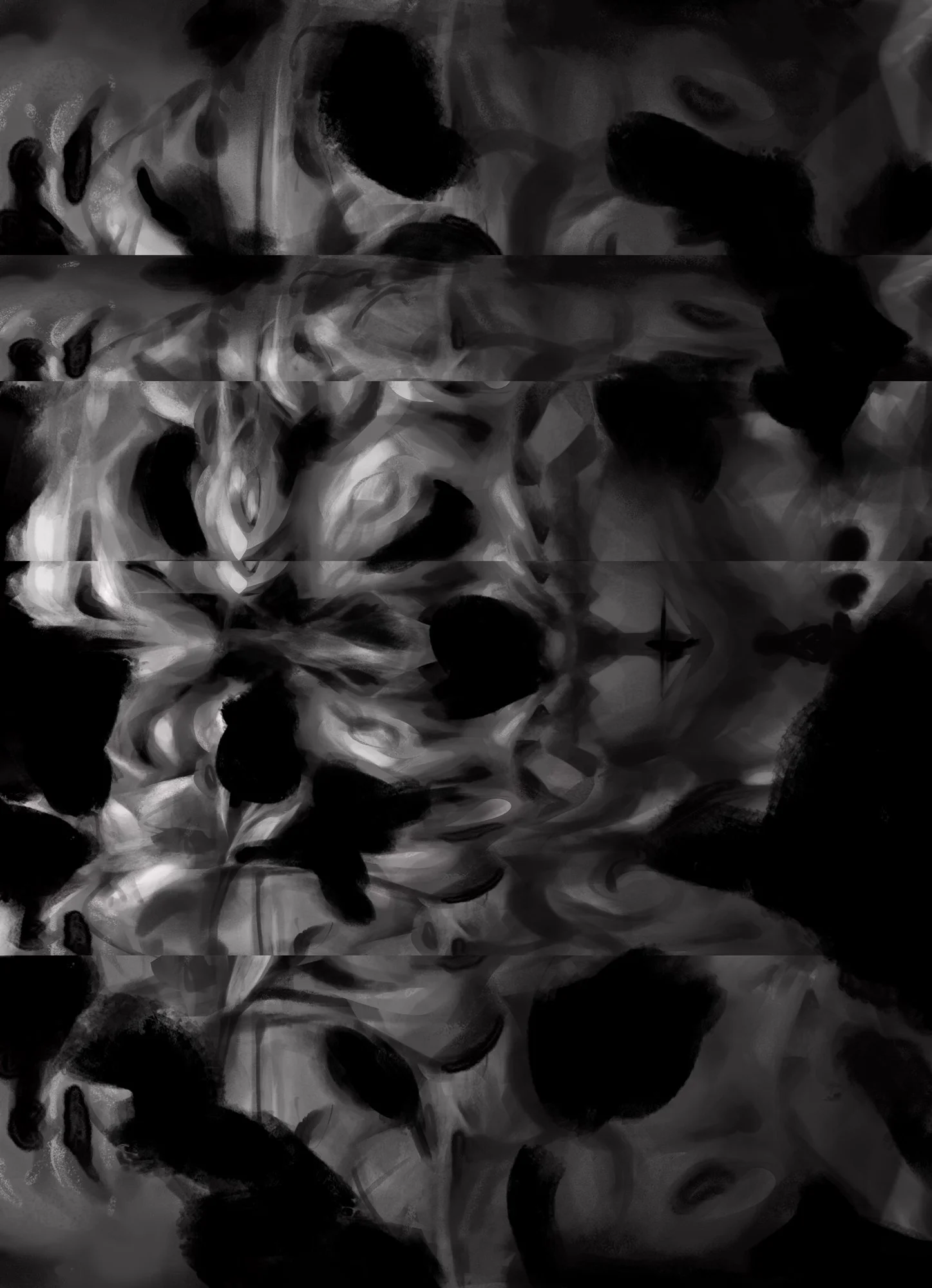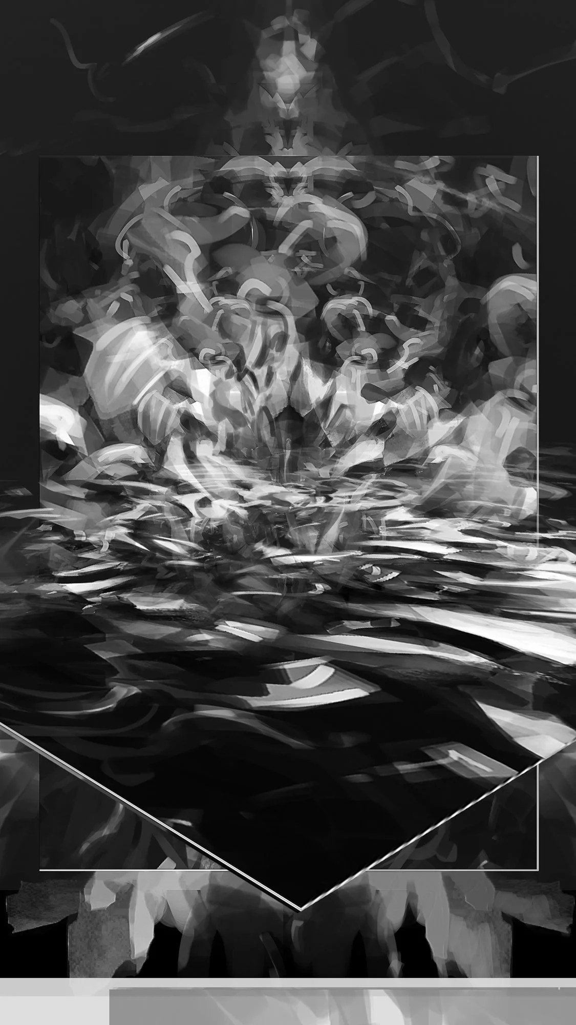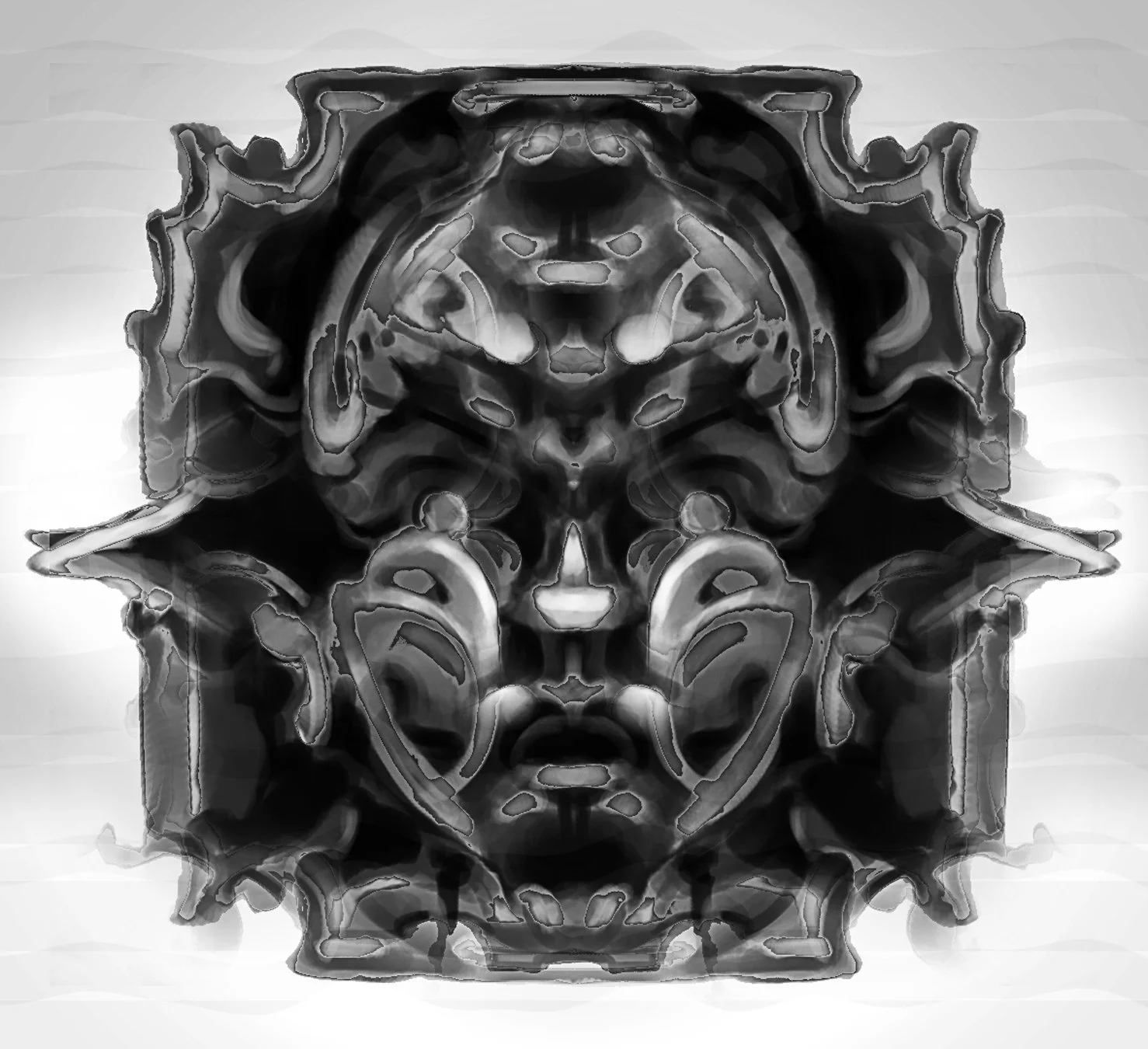 Configuraciones volumétricas que emergen espontáneamente de la superposición de trazos monocromos. Las formas evocan cuerpos, osamentas, máscaras, objetos ornamentados que se despliegan intrincados sobre el entorno oscuro del espacio digital, asumido como ilimitado y carente de gravedad, al estar exento de las restricciones físicas que rigen nuestro mundo material.