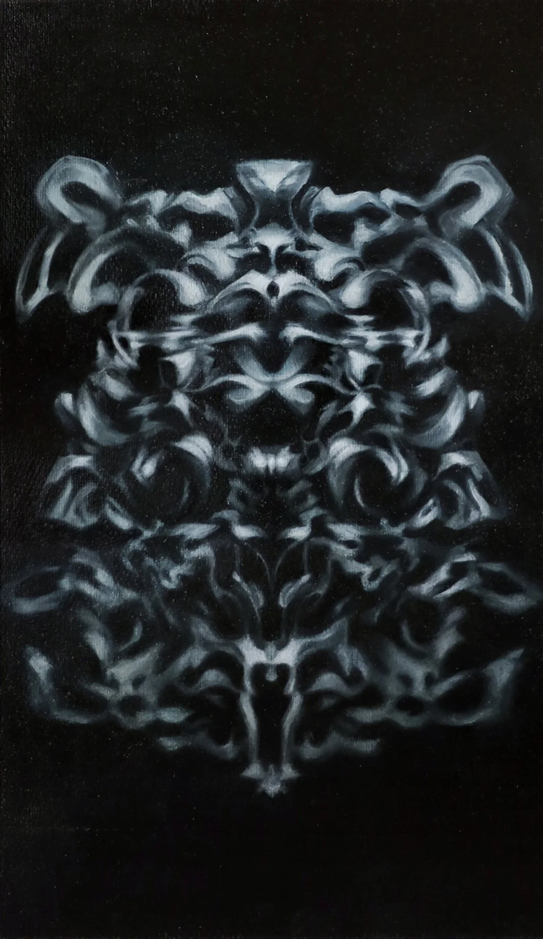 The resulting forms suggest bodies, skeletons, masks, and ornamental objects, unfolding intricately within the dark environment of digital space—conceived as boundless and weightless, free from the physical constraints that rule our material world.